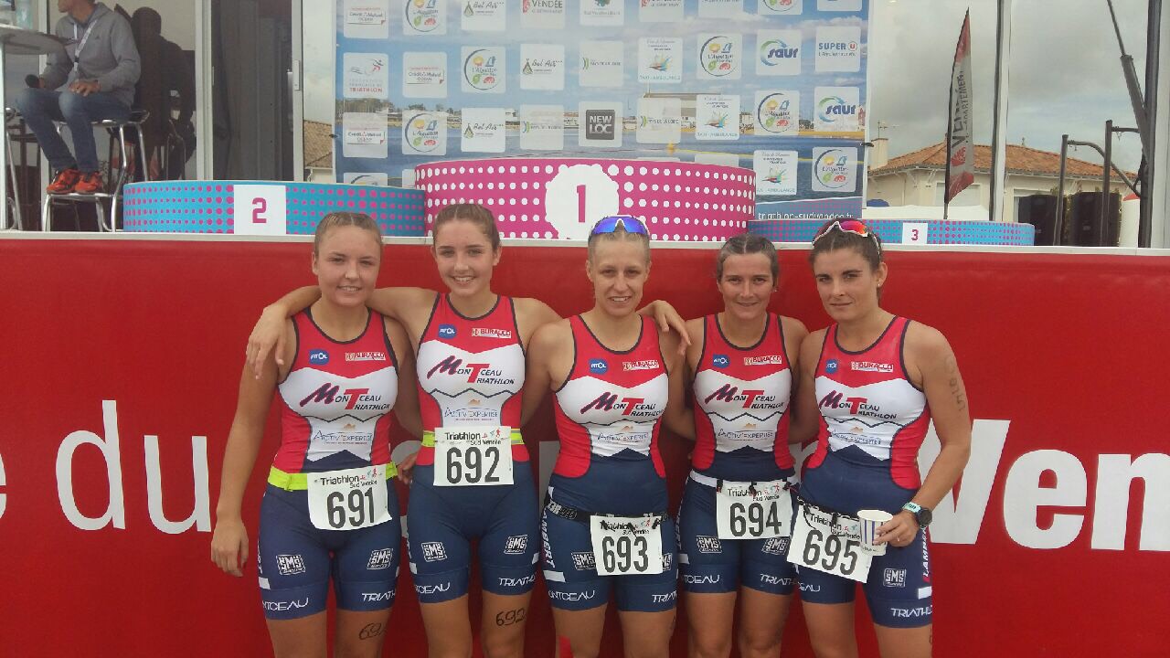 « Après 6h30 de route, les 2 équipes de Montceau Triathlon arrivèrent vendredi soir, au camping de l’Aiguillon sur mer, avec la bonne humeur, malgré un peu de fatigue du trajet.Samedi matin à la fraîche, après une petite reconnaissance du parcours vélo, les 2 équipes se mettaient en action pour le départ en début d’après midi. 13h35, premier départ pour les filles, elles s’élancèrent alors dans une eau à 20.3°C, donc sans combinaison. Après un départ plutôt lent, les filles réussissent cependant à faire une bonne fin de natation. Un petit passage dans le sable et hop elles attaquent le vélo (2 boucles de 10 km), très roulant pour le coup. La suite s’annonçait de manière plus positive avec une bonne partie cycliste. Elles rentrent donc au parc, pour prendre le départ de la course à pied, avec le 10ème temps vélo . Toujours soudées, les 5 filles tiennent bon et font en sorte de s’entraider pour terminer ensemble. Elles terminent ainsi l’épreuve à 5 en 1h14min50sec . Très contentes de leurs performances, elles réussissent à se hisser à la 32ème place, à seulement 40 petites secondes du top 30. Après avoir vu la course des filles, les garçons étaient dans les starting block pour faire briller les couleurs du club, sachant que c’est leur première participation. 15h20: toujours sans combinaison, les gars se lancent à l’assaut de la partie natation. Sortis de l’eau en un