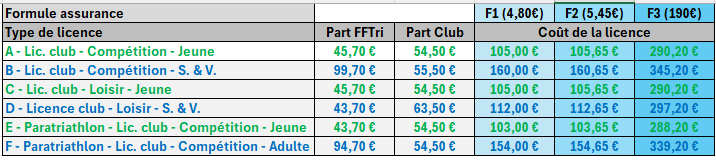 - Une fois votre demande de licence validée sur le site de la FFTri, nous vous contacterons, par e-mail, pour vous confirmer le montant exact de la licence (en fonction du type de licence et du choix de formule d’assurance).